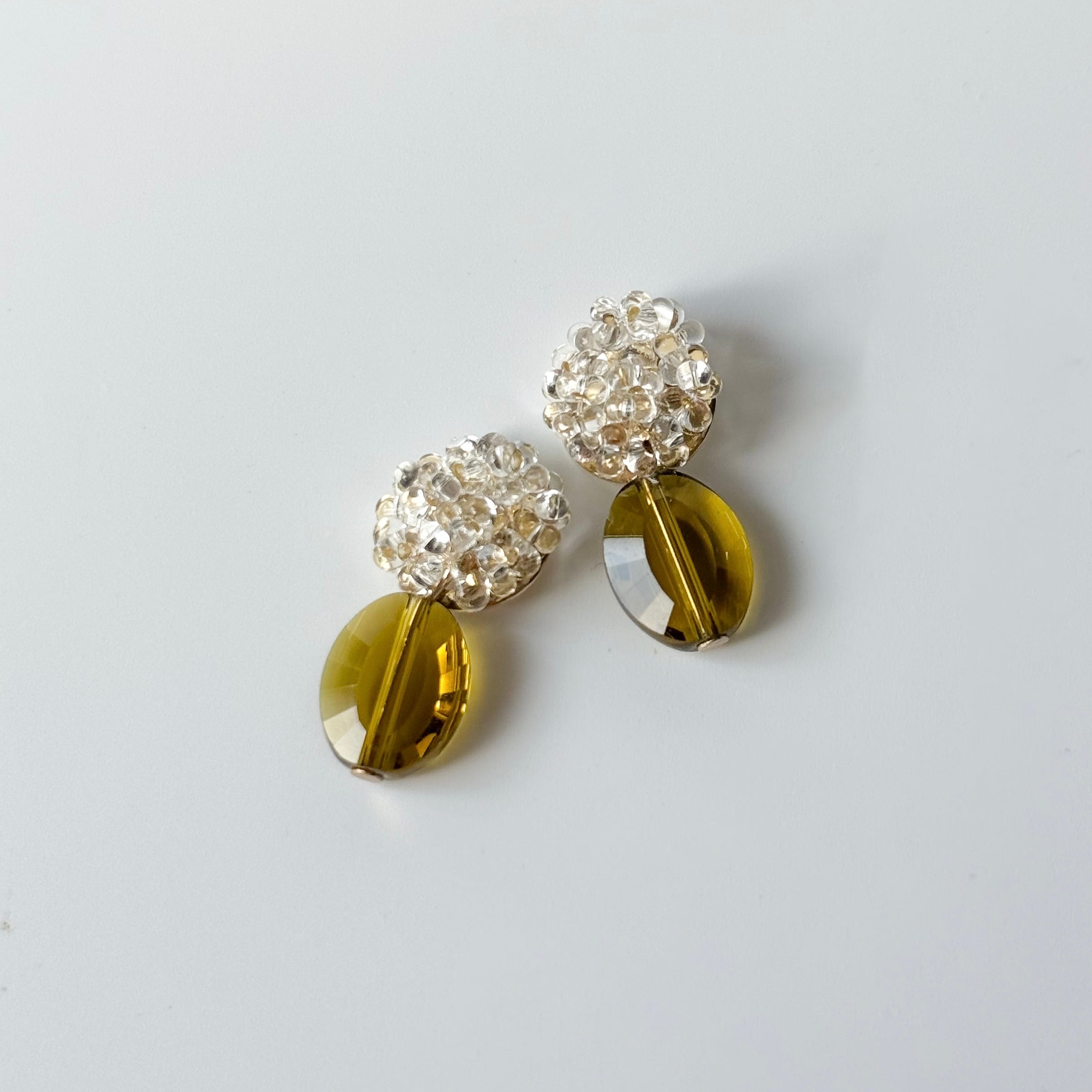 やさしいオリーブ色のヴィンテージガラスビーズを丁寧に編み重ねたアクセサリー